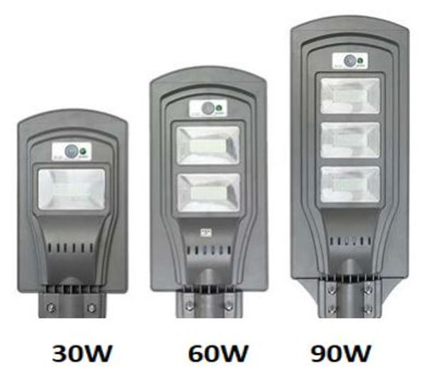Sistemas led con celda solar y batería en una misma carcasa de plástico ABS de 30, 60 y 90w de potencia, IP 65 con garantía de 3 años.