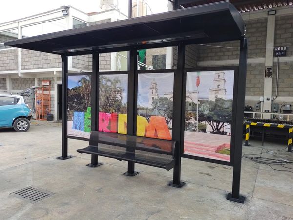 Estructuras metálicas utilizadas como paradas de autobús con espacios para anuncios publicitarios, asiento para usuarios y sistema de iluminación con fotocelda. Fabricados de acuerdo a diseño especial y personalizado para cada espacio urbano y con acabados y colores institucionales.