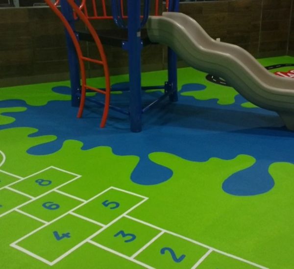 Sistema amortiguante de granulado de caucho con color integral y espesores de 1.5 y 2.5 cm con diseños y colores personalizados. Colado en sitio.